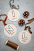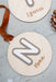 • base de madera contrachapada de abedul grabado con láser e inicial en relieve de doble metacrilato marrón y beige mate.